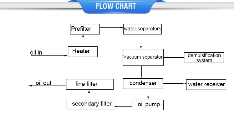 When the hydraulic oil purification machine is working, the polluted oil enters the heater through the inlet under the action of the vacuum suction of the external atmospheric pressure, the heated oil enters the prefilter, the large particles of impurities are filtered out, and then the oil enters the water separator for vacuum separation. The device flows through a special divergent device. The diffuser creates a large surface area per unit volume of oil, exposing the contaminated oil to a vacuum with very low relative humidity, thereby removing water, air and gas from the oil. The mixed gas formed by the evaporated water vapor and gas is condensed into liquid through the water tank and the cooler, and enters the water storage tank together, and the remaining gas is pumped out by the vacuum pump. The oil that has removed the water is sent to the second-stage filter element and the fine filter by the oil discharge pump to remove particulate impurities, that is, to purify the oil. A purification process is completed. According to the amount of water content, multiple cycles are required to completely remove the water.